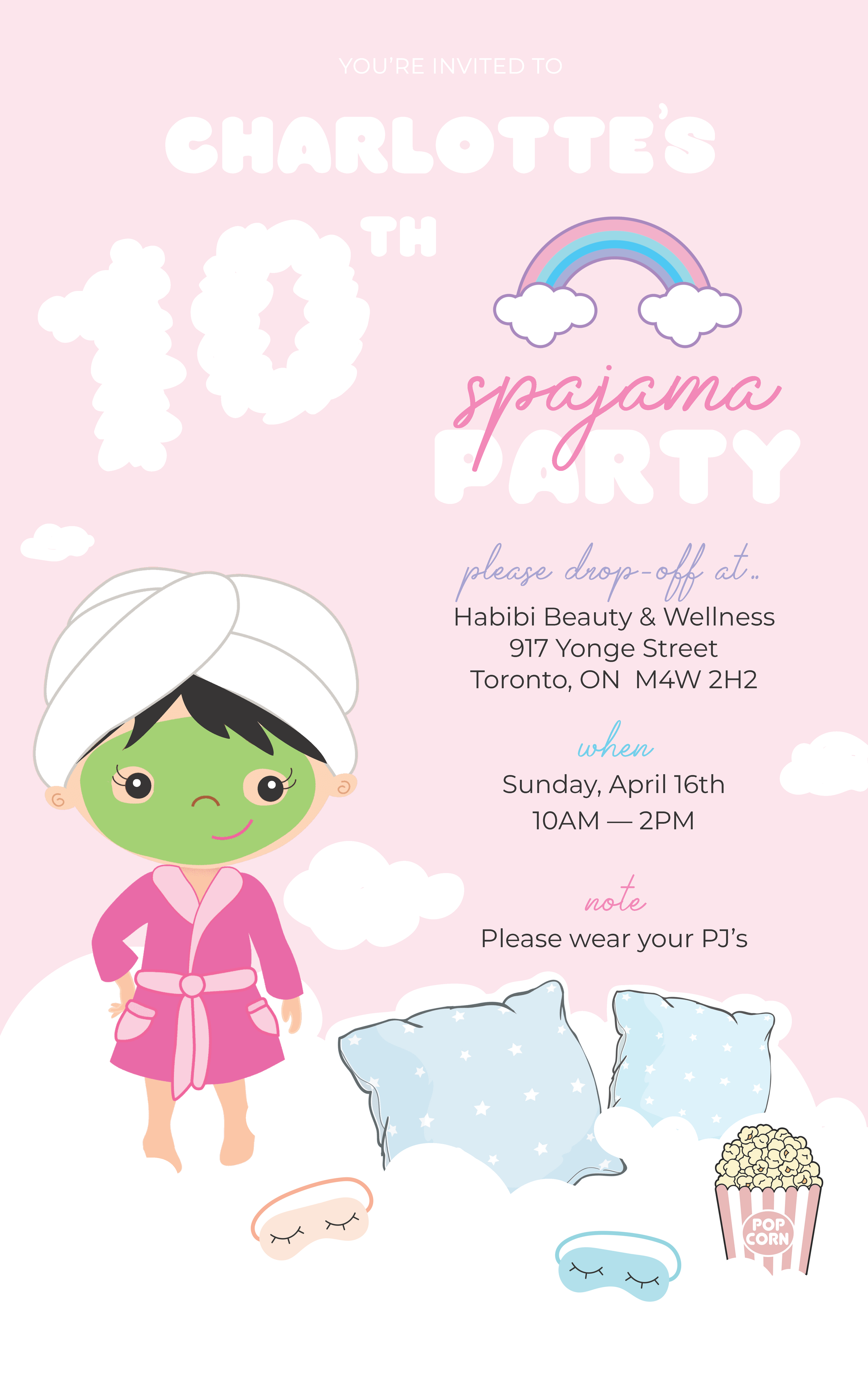 To set the tone for Charlotte’s party, I designed vibrant, playful invitations that perfectly matched the theme. Featuring a pastel palette and spa-inspired elements, the e-invites invited guests to a day of beauty and fun—giving a joyful first glimpse of the celebration to come.
